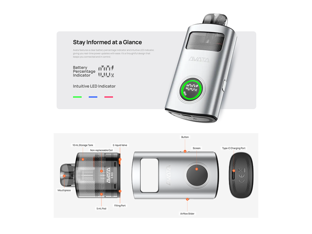 Jedná sa o kompaktný POD systém s rozmermi 94,8×44×23mm s integrovanou batériou s kapacitou 1100mAh a USB-C portom s podporou nabíjania 1A. Podľa výrobcu je kapacita batérie v tomto prípade dostatočná na celodenný vaping. Telo je vyrobené z prémiovej hliníkovej zlatiny, vďaka čomu pôsobí skutočne špičkovo. Zároveň v tele je veľký otvor, vďaka ktorému má používateľ neustály prehľad o zostávajúcej zásobe e-liquidu.