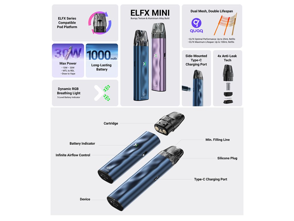 E-cigareta využíva nové ELFX cartridge s dvojitým mesh pletivom s horným plnením - nie je ich potrebné vyberať z e-cigarety pri plnení e-liquidu. Tieto cartridge zabezpečujú ešte výraznejšiu chuť e-liquidu.