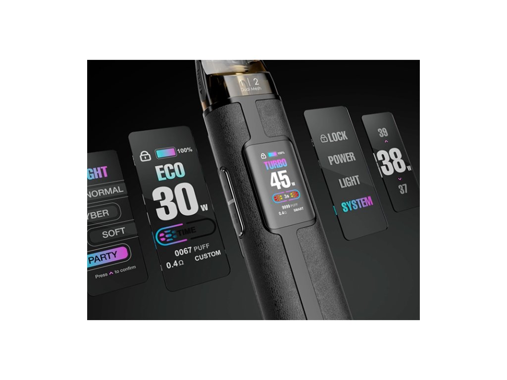 Telo batérie je potiahnuté vegánskou kožou, ktorá odoláva opotrebovaniu a zároveň dodáva prvotriedny pocit kvality. Na displeji sú prehľadne zobrazené informácie o výkone, stave batérie, odpore použitého cartridge, počet potiahnutí.