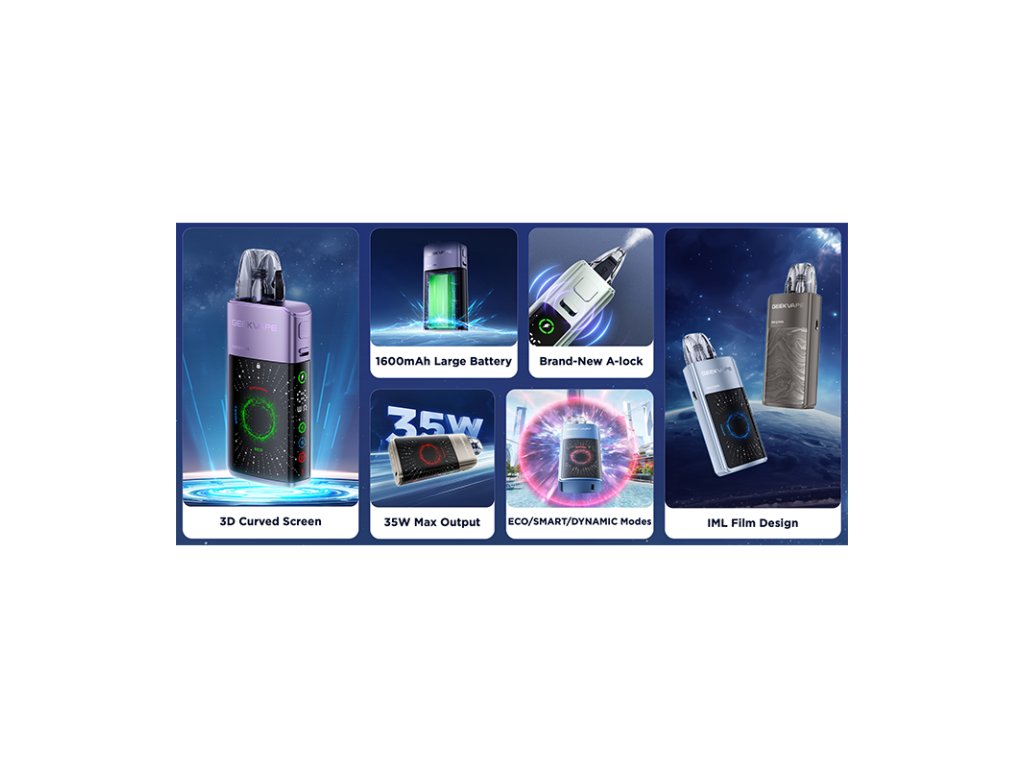 Dominantným prvkom tejto e-cigarety je však revolučný zakrivený displej, ktorý nielen skvelo vyzerá, ale hlavne umožňuje plynulé a intuitívne ovládanie. Celý systém sa ovláda pomocou jediného tlačítka, ktoré dopĺňa bezpečnostný zámok A-Lock - jednoduchým prepnutím sa tak dá e-cigareta uzamknúť, čo zabráni spusteniu žhavenia napr. pri prenášaní vo vrecku.