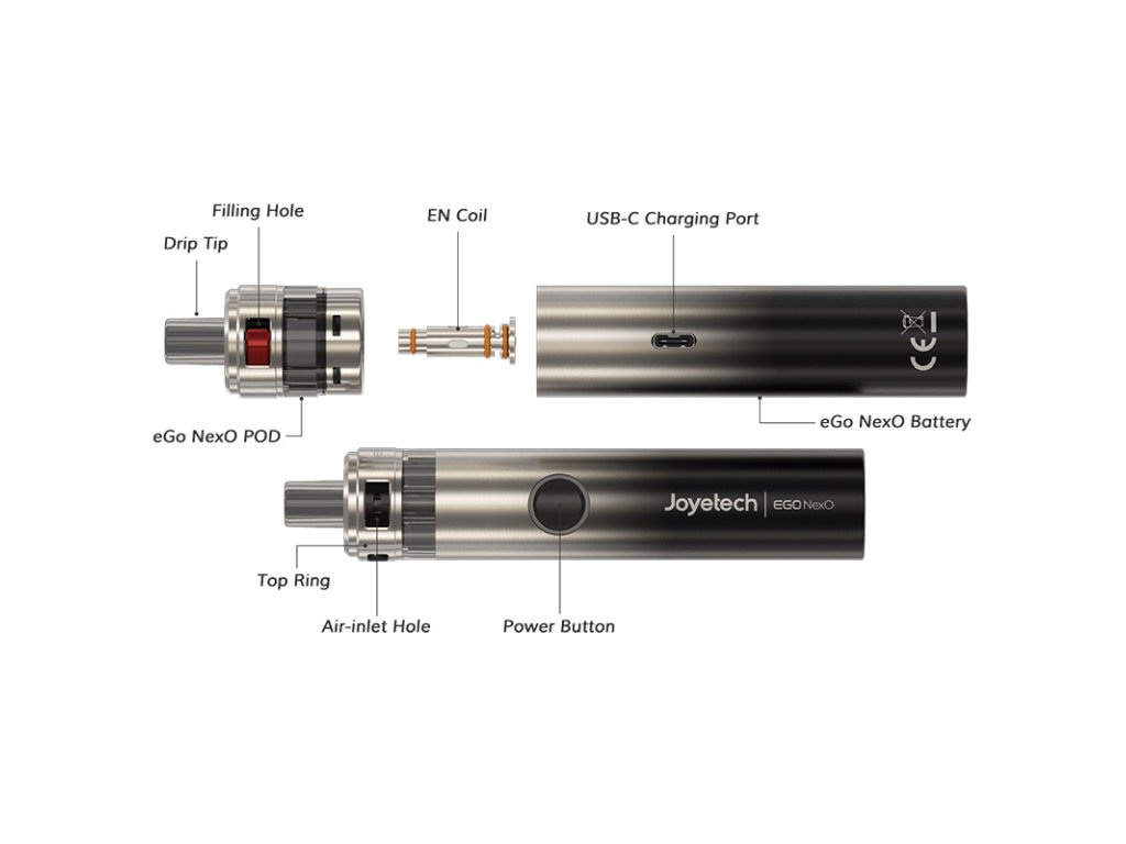 Súčasťou sady je nový Joyetech eGo NexO cartridge s kapacitou 2ml e-liquidu. Na jeho bočnej strane sa nachádza silikónový uzáver, po jeho otvorení je možné doplniť e-liquid. Tento cartridge sa používa s atomizérmi Joyetech EN.